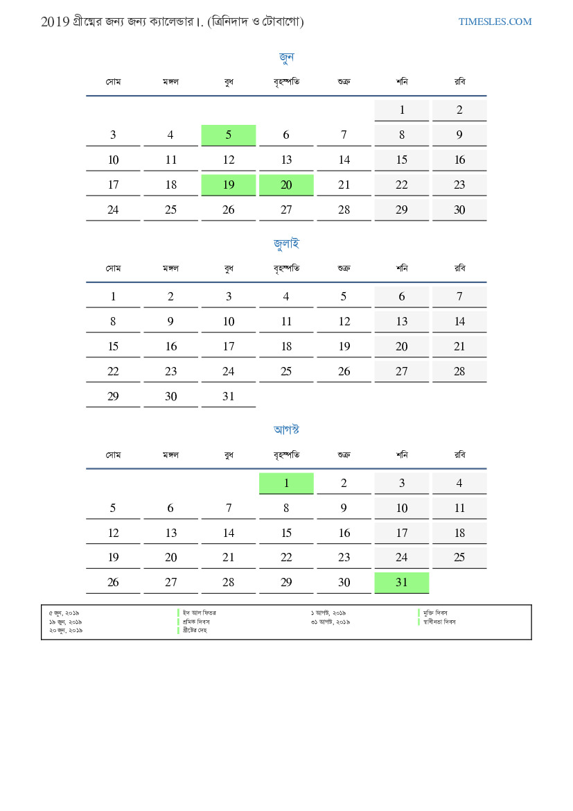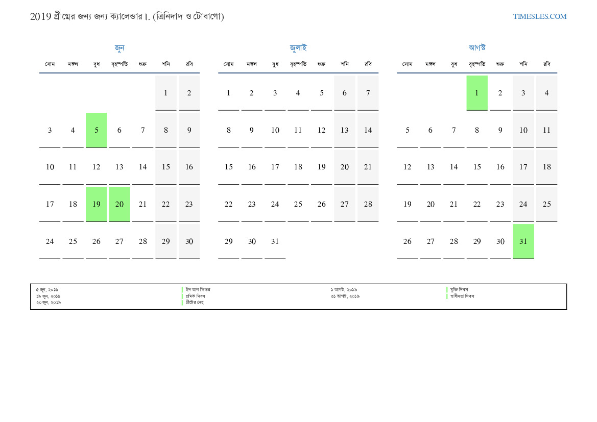 ত্রিনিদাদ ও টোবাগো এর জন্য 2019 সালের গ্রীষ্মের জন্য ক্যালেন্ডার