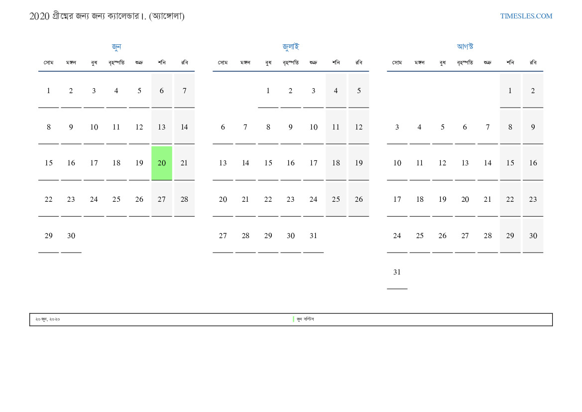 অ্যাঙ্গোলা জন্য 2020 সালের গ্রীষ্মের জন্য ছুটি এবং সাপ্তাহিক ছুটির সাথে পিডিএফ ক্যালেন্ডার ডাউনলোড এবং মুদ্রণ করুন