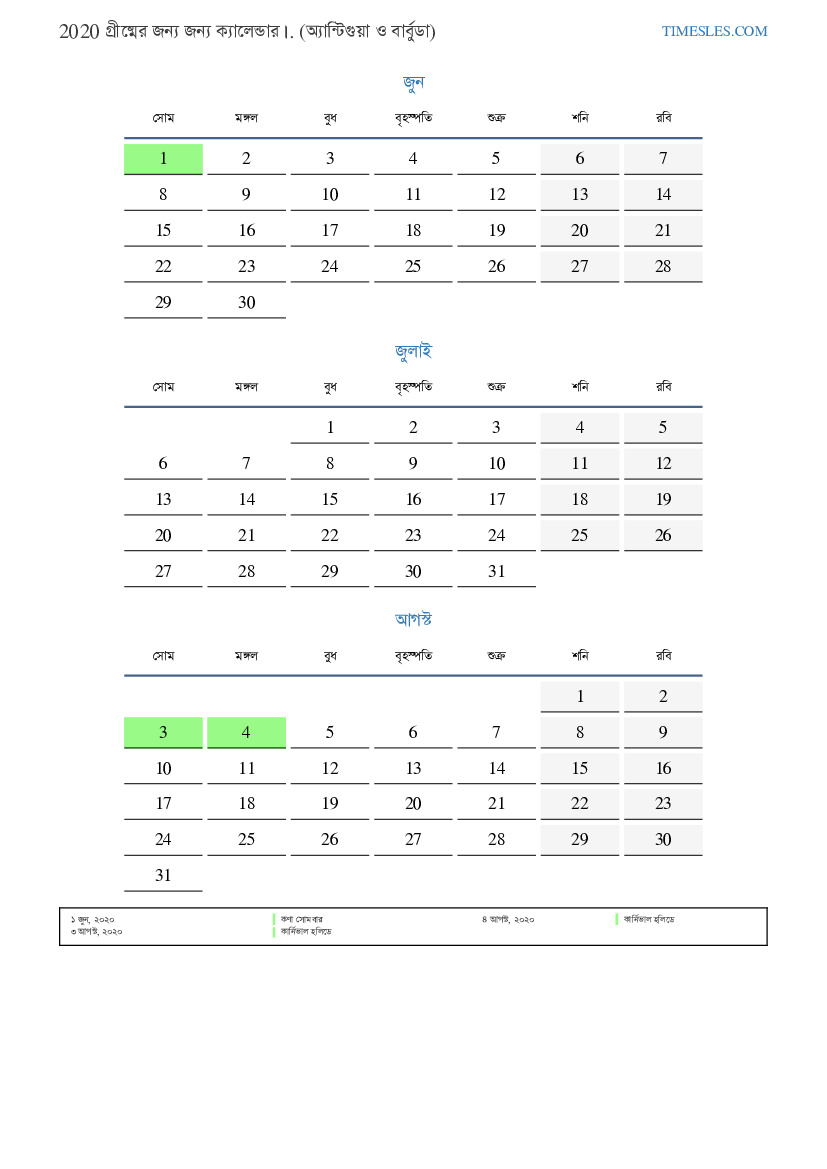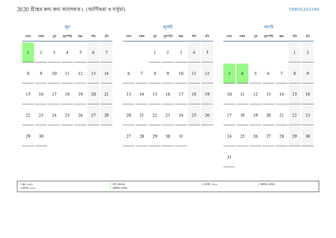 অ্যান্টিগুয়া এবং বার্বুডা জন্য 2020 সালের গ্রীষ্মের জন্য ক্যালেন্ডার