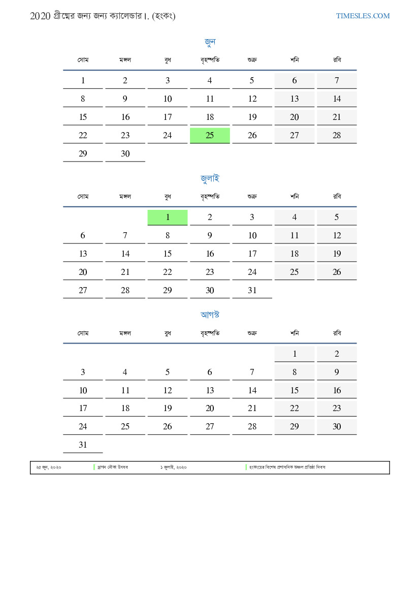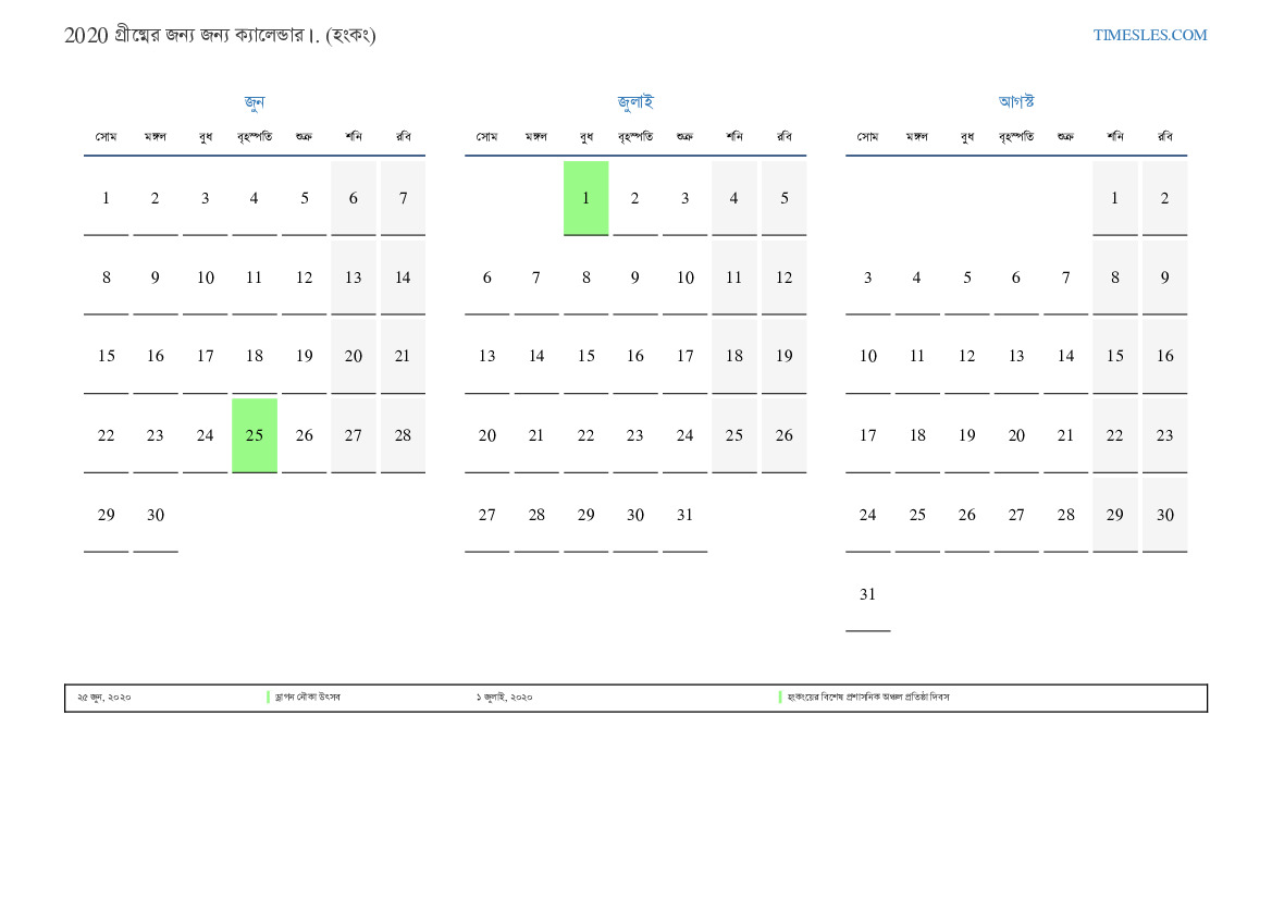 হংকংয়ের জন্য 2020 সালের গ্রীষ্মের জন্য ক্যালেন্ডার
