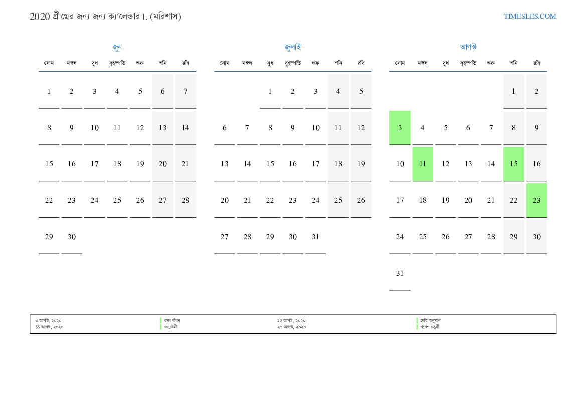 মরিশাসের জন্য 2020 সালের গ্রীষ্মের জন্য ক্যালেন্ডার