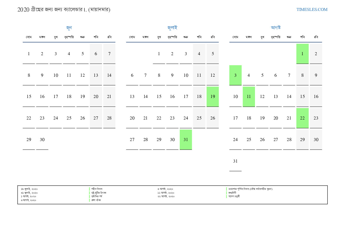 মায়ানমারের জন্য 2020 সালের গ্রীষ্মের জন্য ক্যালেন্ডার