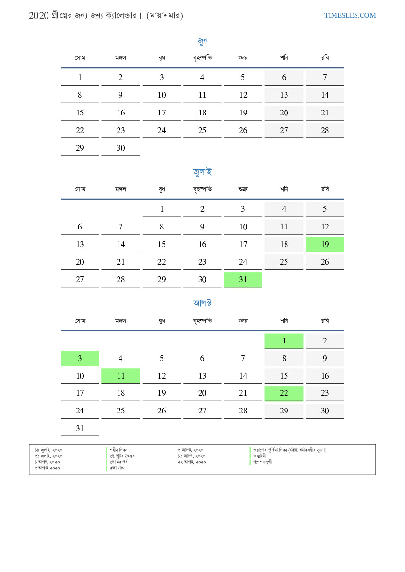 মায়ানমারের জন্য 2020 সালের গ্রীষ্মের জন্য ছুটির দিনগুলি এবং সাপ্তাহিক ছুটির দিনগুলি