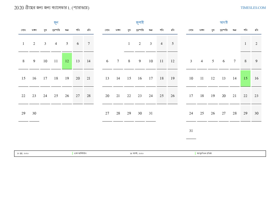 প্যারাগুয়ের জন্য 2020 সালের গ্রীষ্মের জন্য ক্যালেন্ডার