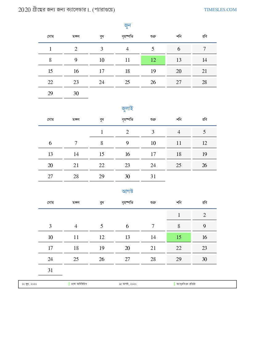 2020 সালের গ্রীষ্মকালে প্যারাগুয়ে ৩ ছুটি এবং দিন ছুটি থাকে। গ্রীষ্ম কালীন 2121 সোমবারে শুরু হয়ে সোমবারে শেষ হবে।