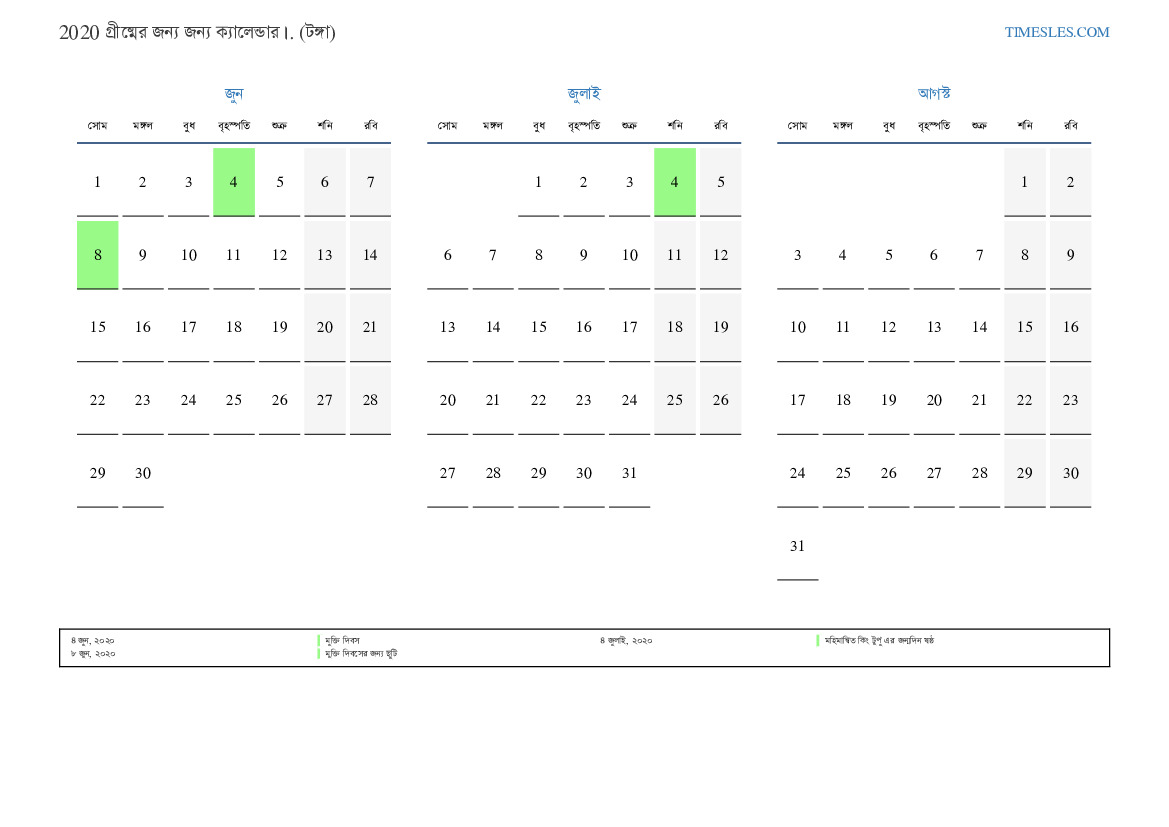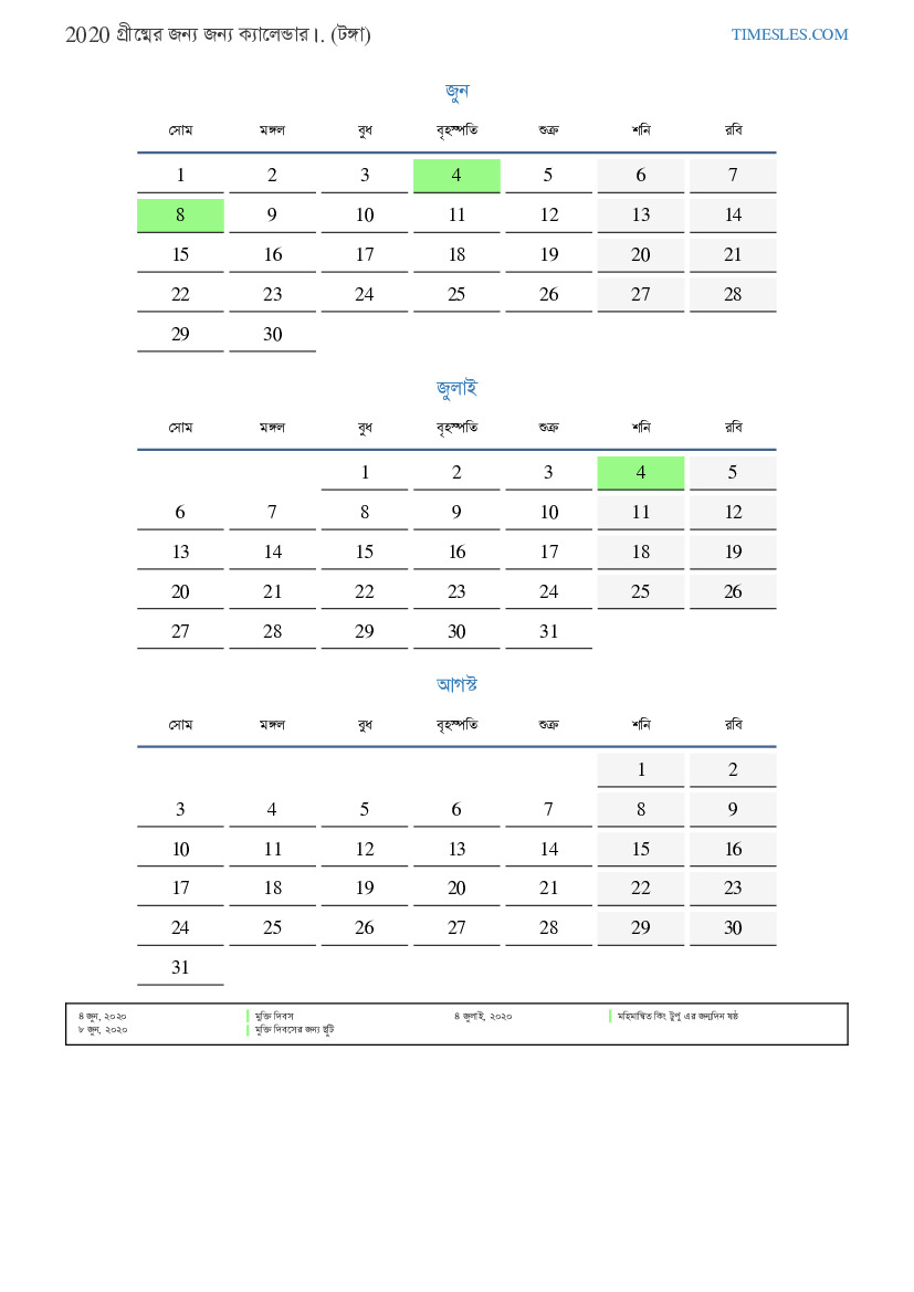 টঙ্গার জন্য 2020 সালের গ্রীষ্মের জন্য ছুটি এবং সাপ্তাহিক ছুটির সাথে পিডিএফ ক্যালেন্ডার ডাউনলোড এবং মুদ্রণ করুন