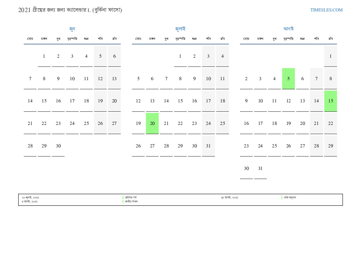 বুর্কিনা ফাসোর জন্য 2021 সালের গ্রীষ্মের জন্য ছুটি এবং সাপ্তাহিক ছুটির সাথে পিডিএফ ক্যালেন্ডার ডাউনলোড এবং মুদ্রণ করুন