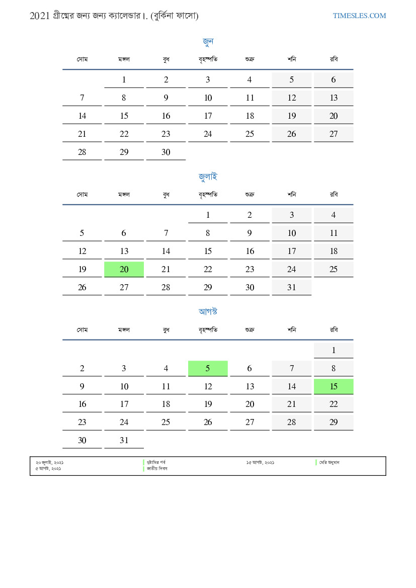 বুর্কিনা ফাসোর জন্য 2021 সালের গ্রীষ্মের জন্য ছুটির দিনগুলি এবং সাপ্তাহিক ছুটির দিনগুলি