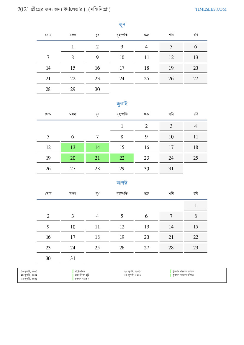 মন্টিনিগ্রোর জন্য 2021 সালের গ্রীষ্মের জন্য ছুটি এবং সাপ্তাহিক ছুটির সাথে পিডিএফ ক্যালেন্ডার ডাউনলোড এবং মুদ্রণ করুন