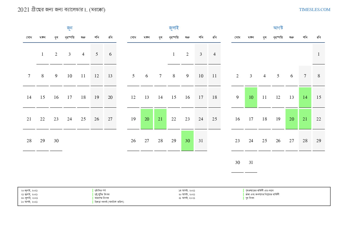 মরক্কোর জন্য 2021 সালের গ্রীষ্মের জন্য ক্যালেন্ডার