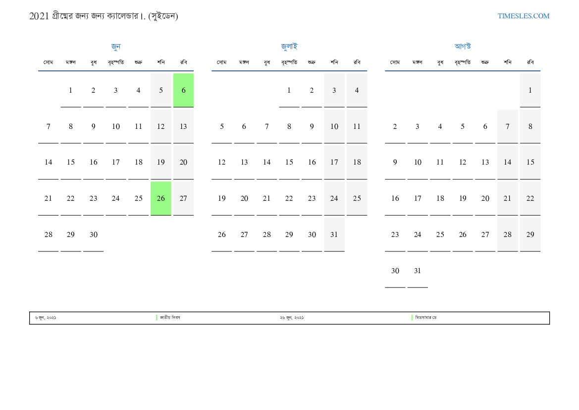 সুইডেনের জন্য 2021 সালের গ্রীষ্মের জন্য ক্যালেন্ডার