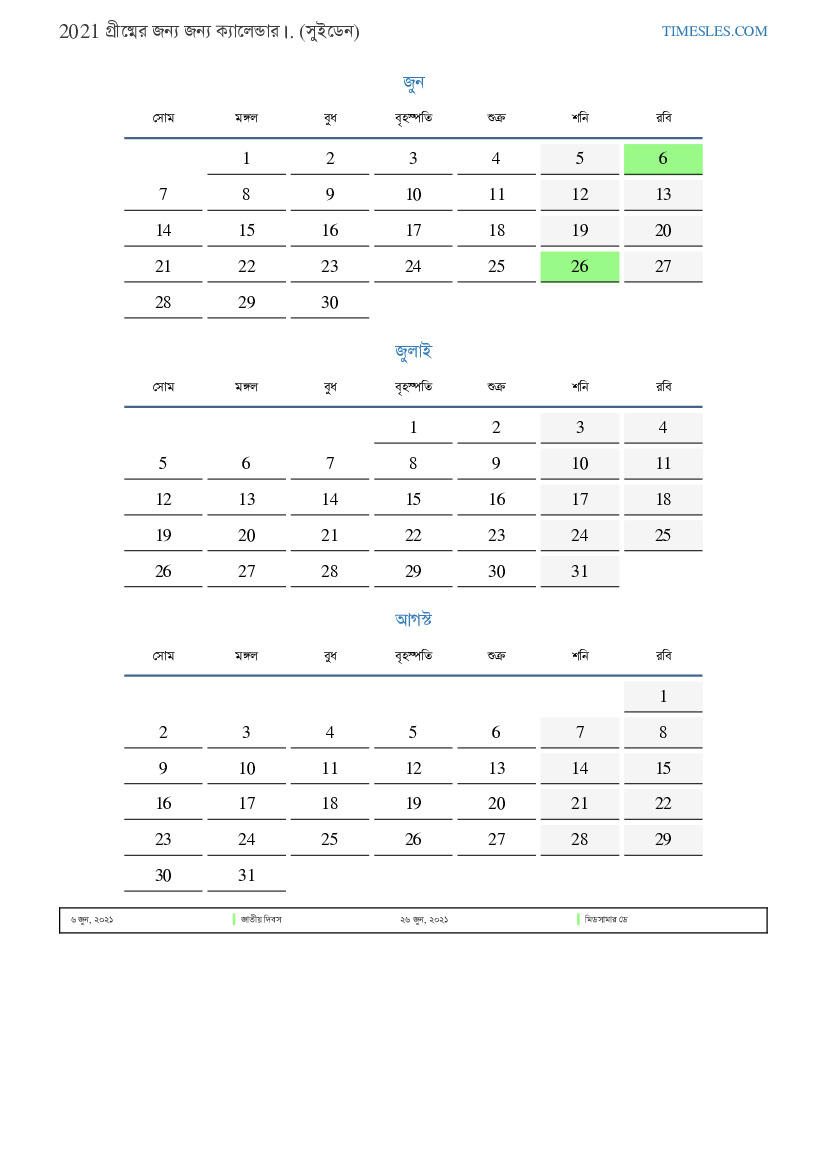 সুইডেনের জন্য 2021 সালের গ্রীষ্মের জন্য ছুটির দিনগুলি এবং সাপ্তাহিক ছুটির দিনগুলি