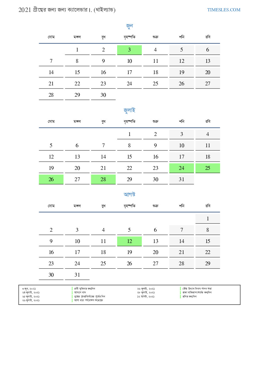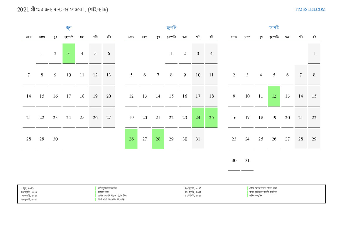থাইল্যান্ডের জন্য 2021 সালের গ্রীষ্মের জন্য ক্যালেন্ডার