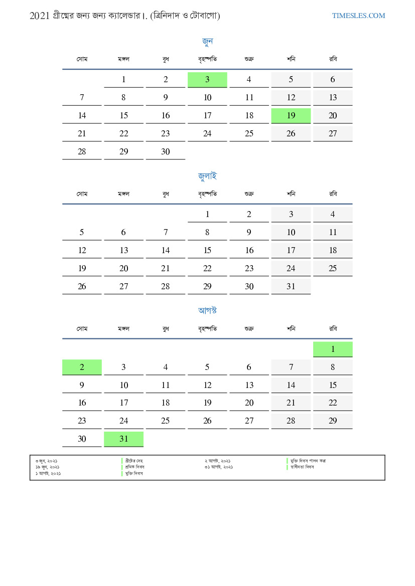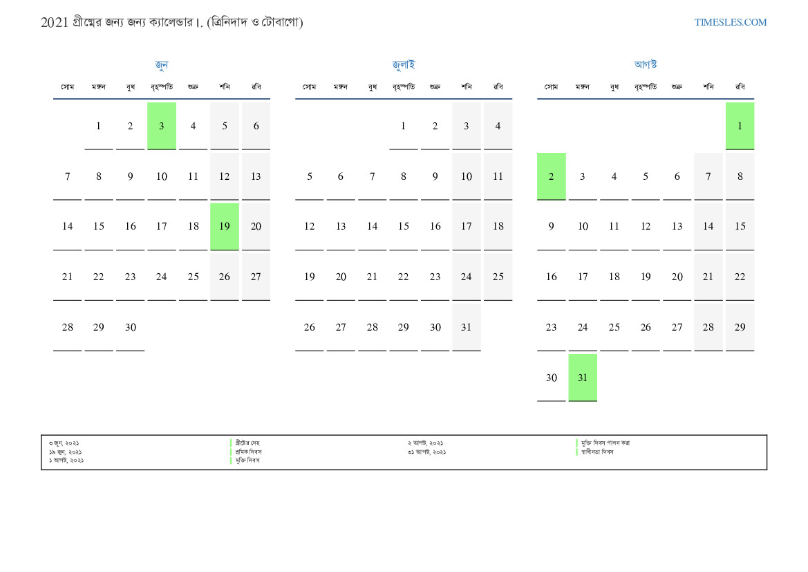 ত্রিনিদাদ ও টোবাগো এর জন্য 2021 সালের গ্রীষ্মের জন্য ক্যালেন্ডার