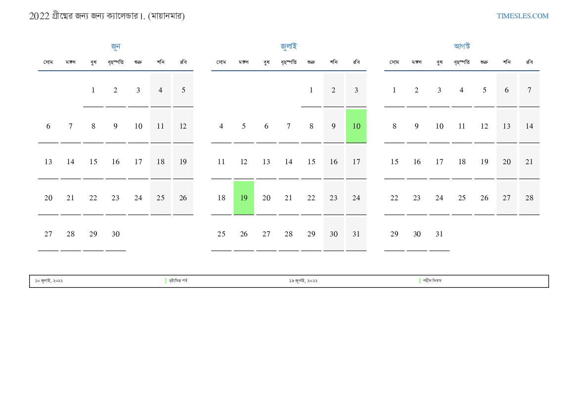 মায়ানমারের জন্য 2022 সালের গ্রীষ্মের জন্য ক্যালেন্ডার