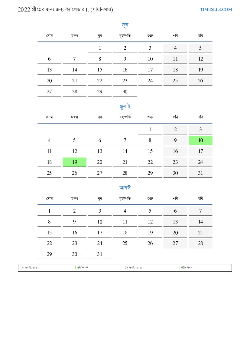 মায়ানমারের জন্য 2022 সালের গ্রীষ্মের জন্য ছুটির দিনগুলি এবং সাপ্তাহিক ছুটির দিনগুলি