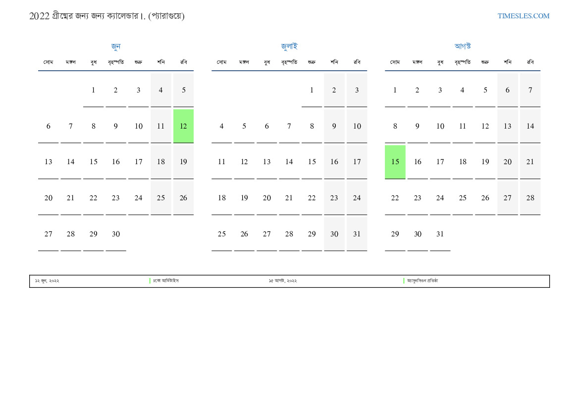 প্যারাগুয়ের জন্য 2022 সালের গ্রীষ্মের জন্য ছুটির দিনগুলি এবং সাপ্তাহিক ছুটির দিনগুলি