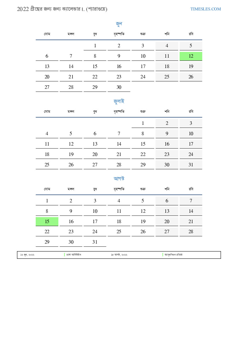 প্যারাগুয়ের জন্য 2022 সালের গ্রীষ্মের জন্য ক্যালেন্ডার