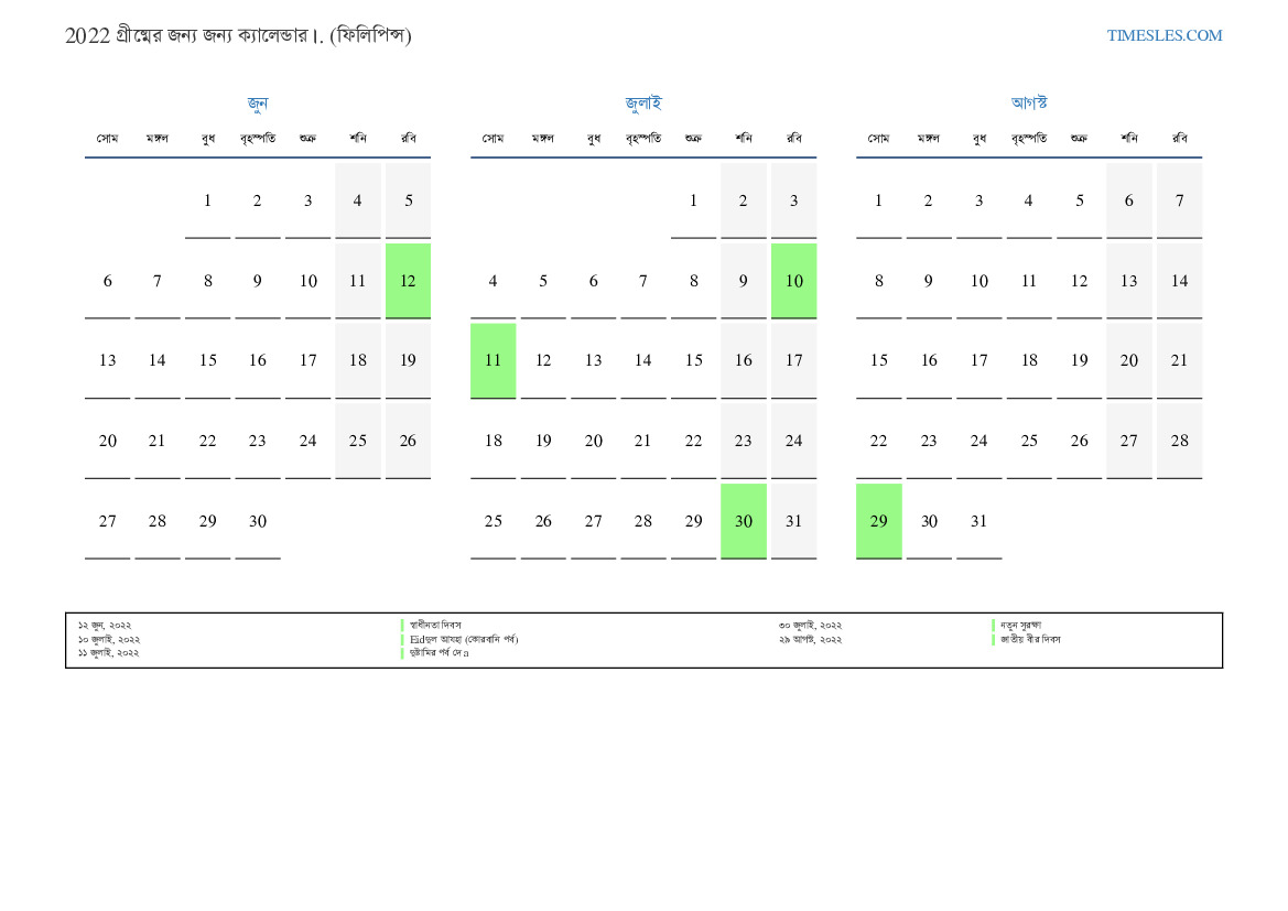 ফিলিপাইন জন্য 2022 সালের গ্রীষ্মের জন্য ক্যালেন্ডার
