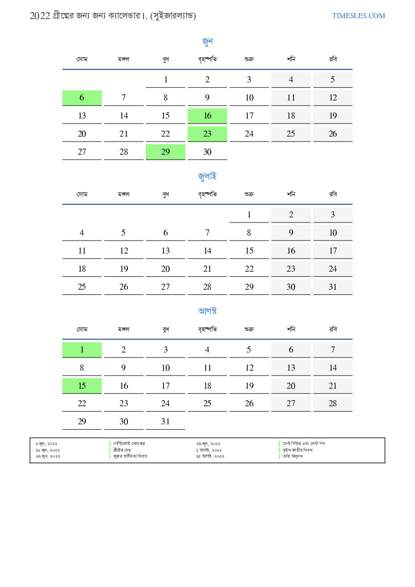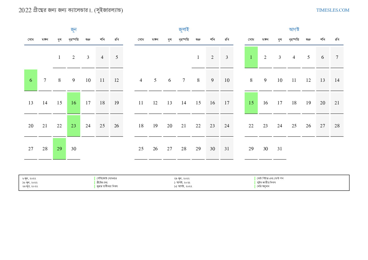 সুইজারল্যান্ডের জন্য 2022 সালের গ্রীষ্মের জন্য ছুটির দিনগুলি এবং সাপ্তাহিক ছুটির দিনগুলি