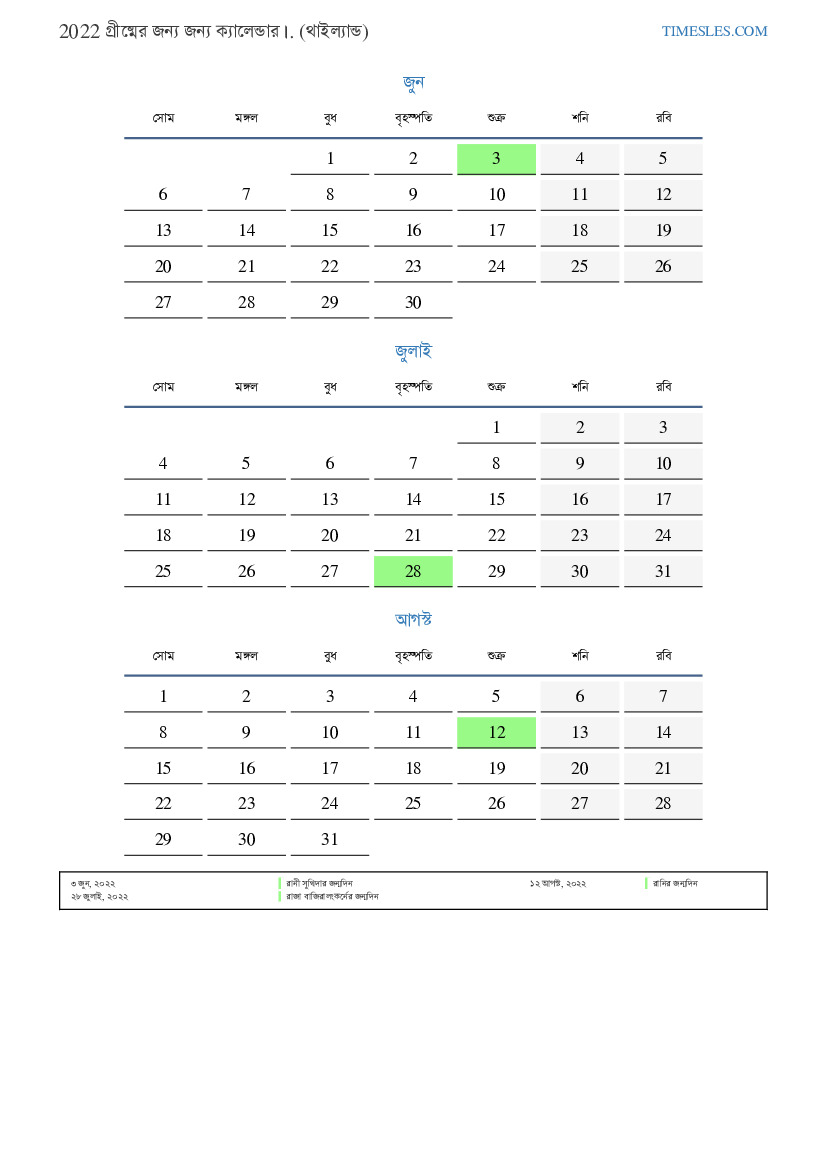 থাইল্যান্ডের জন্য 2022 সালের গ্রীষ্মের জন্য ক্যালেন্ডার