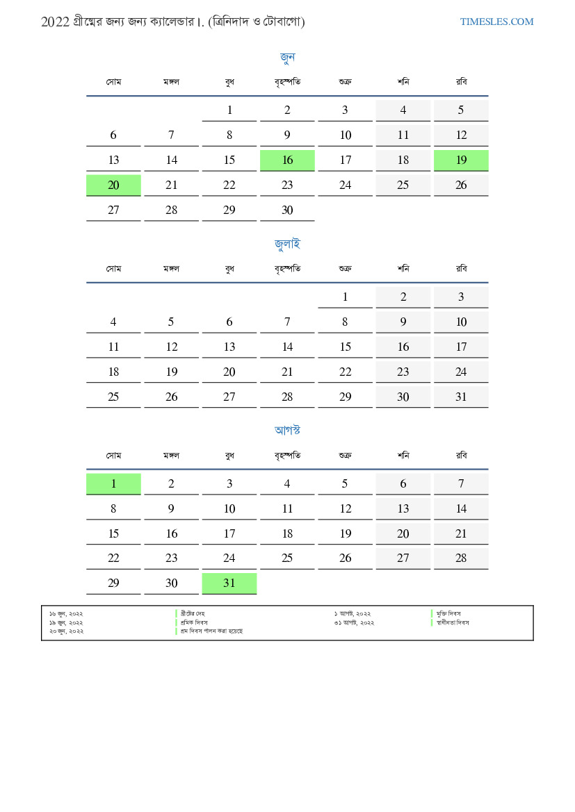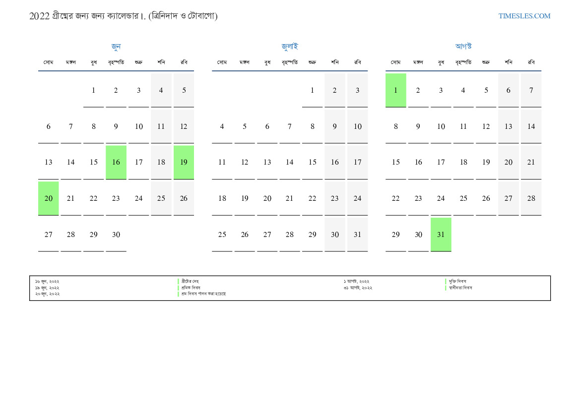 ত্রিনিদাদ ও টোবাগো এর জন্য 2022 সালের গ্রীষ্মের জন্য ছুটি এবং সাপ্তাহিক ছুটির সাথে পিডিএফ ক্যালেন্ডার ডাউনলোড এবং মুদ্রণ করুন