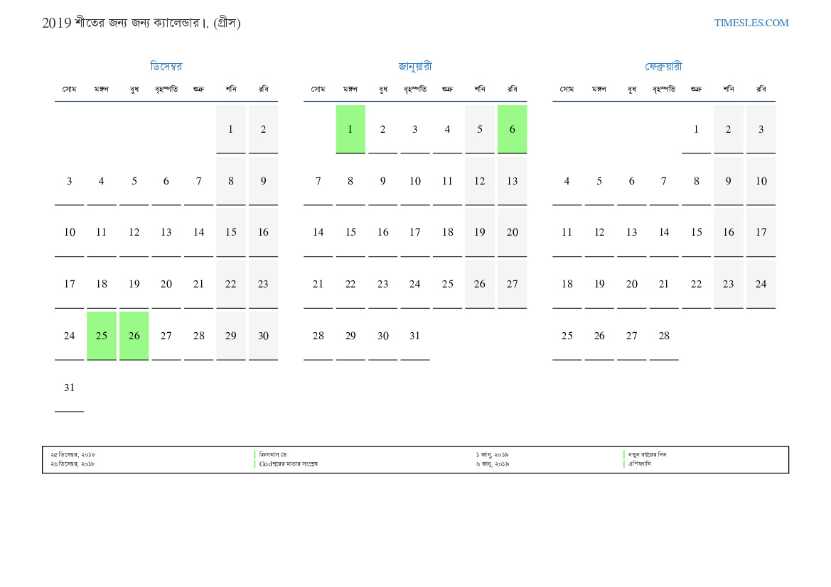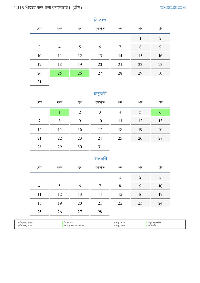 গ্রিসের জন্য 2019 সালের শীতের জন্য ক্যালেন্ডার