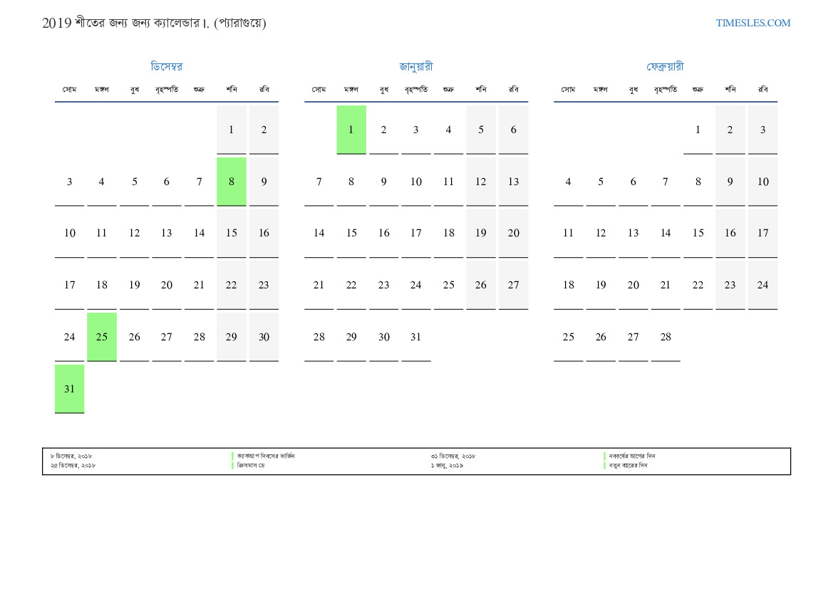 প্যারাগুয়ের জন্য 2019 সালের শীতের জন্য ছুটির দিনগুলি এবং সাপ্তাহিক ছুটির দিনগুলি