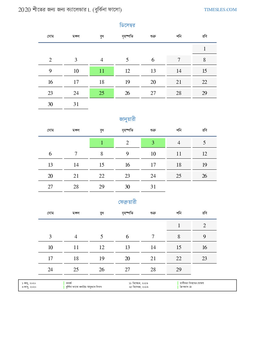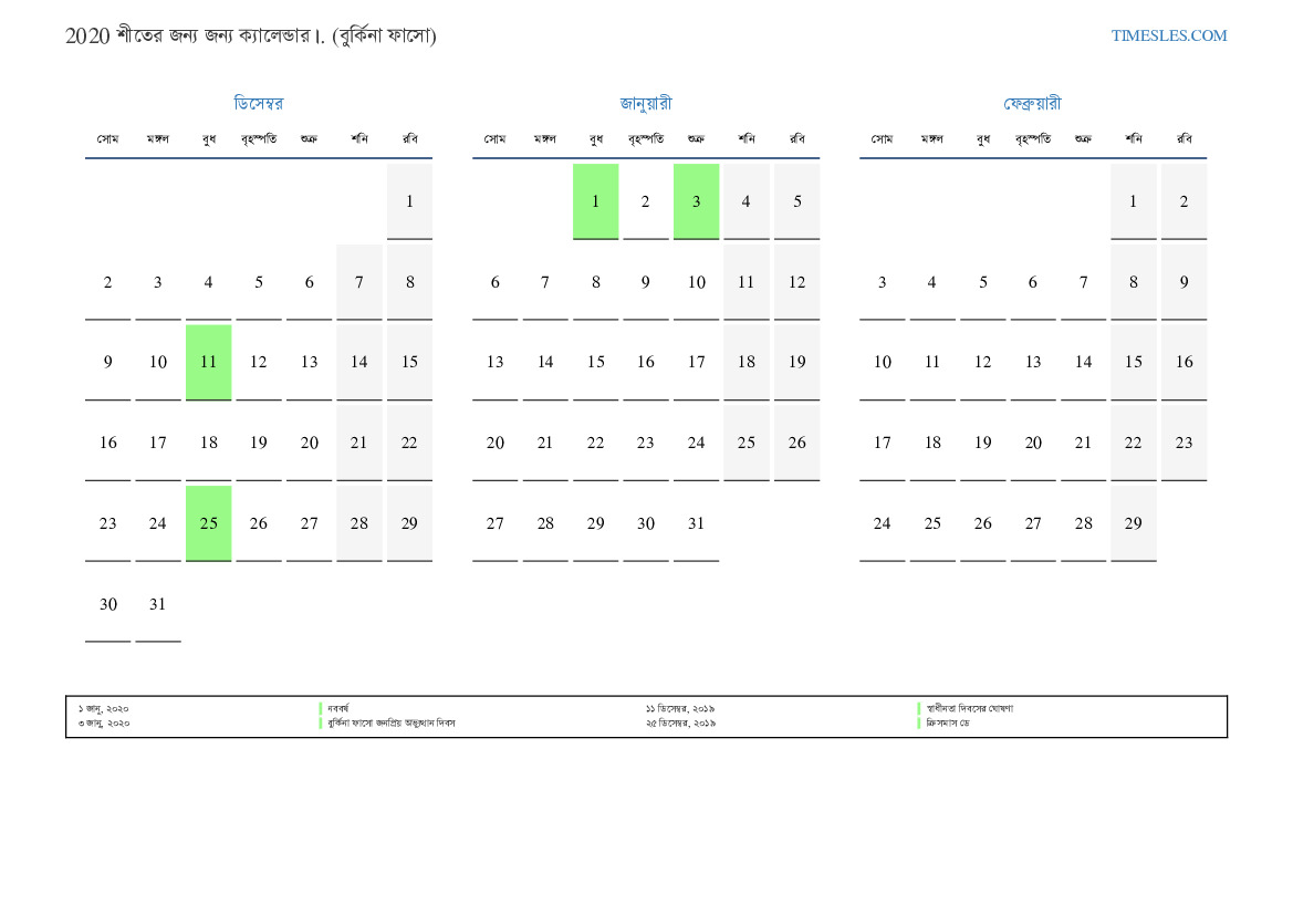 বুর্কিনা ফাসোর জন্য 2020 সালের শীতের জন্য ছুটি এবং সাপ্তাহিক ছুটির সাথে পিডিএফ ক্যালেন্ডার ডাউনলোড এবং মুদ্রণ করুন