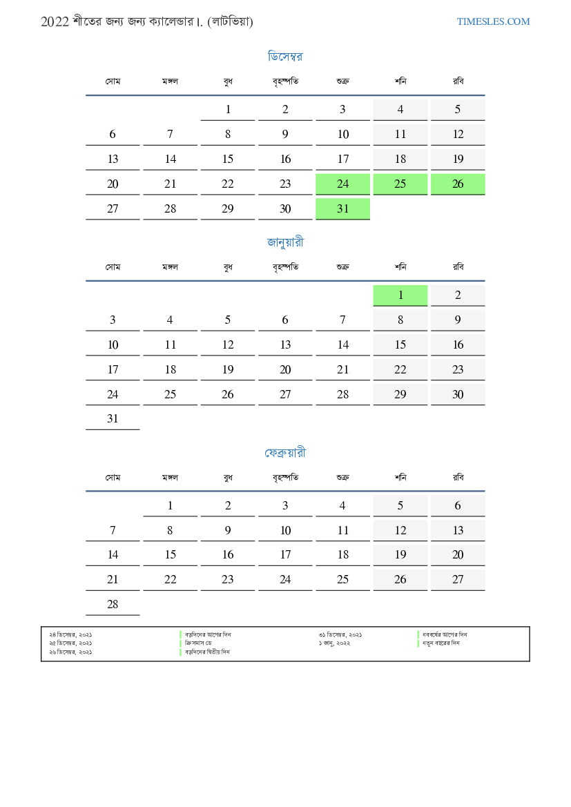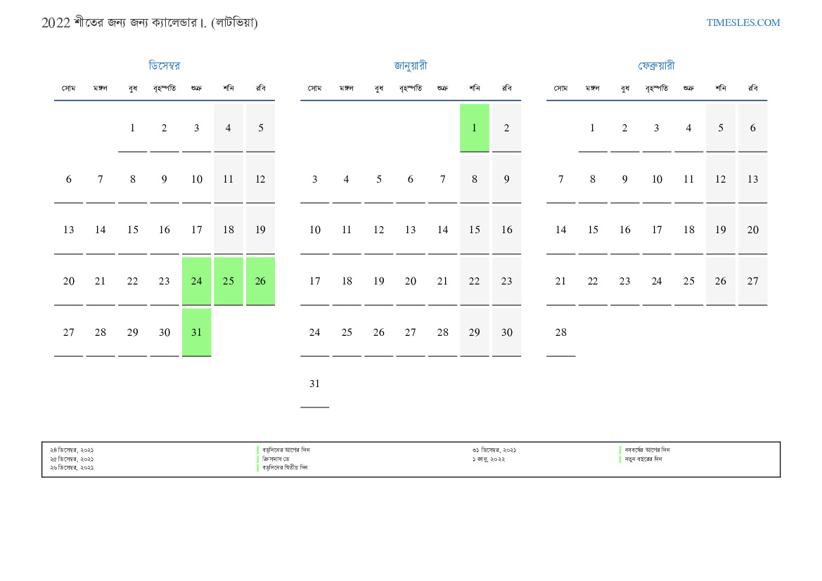 লাটভিয়ার জন্য 2022 সালের শীতের জন্য ছুটির দিনগুলি এবং সাপ্তাহিক ছুটির দিনগুলি
