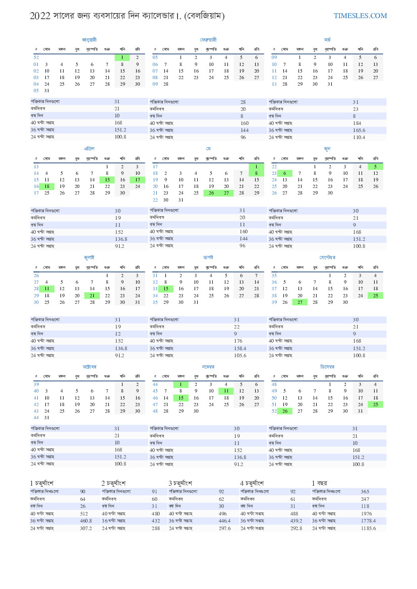 বেলজিয়ামের জন্য 2022 জানুয়ারির কার্যদিবস