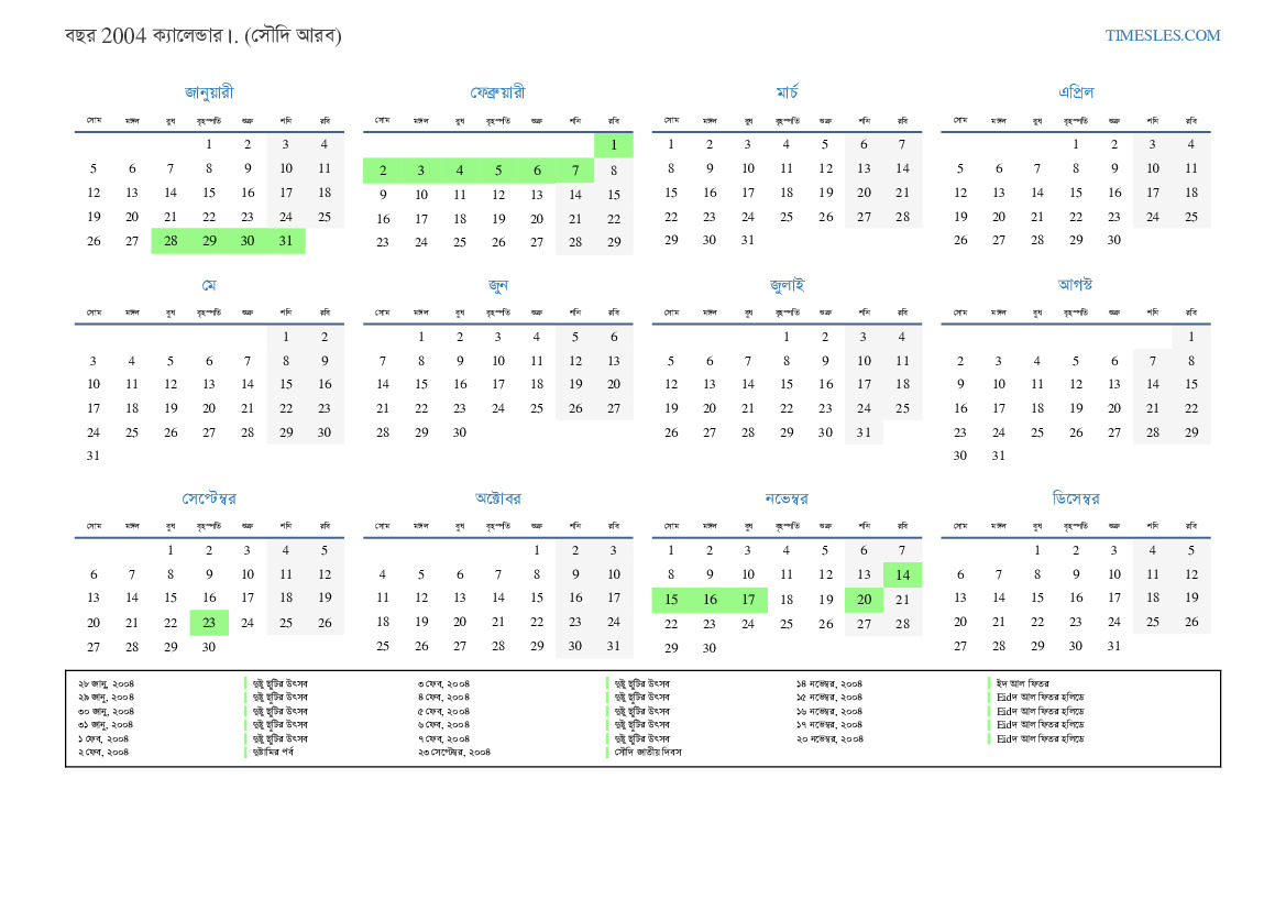 ১৯ নভেম্বর, ২০০৪ Eidদুল ফিতর হলিডে (কেবলমাত্র সরকারী খাত)