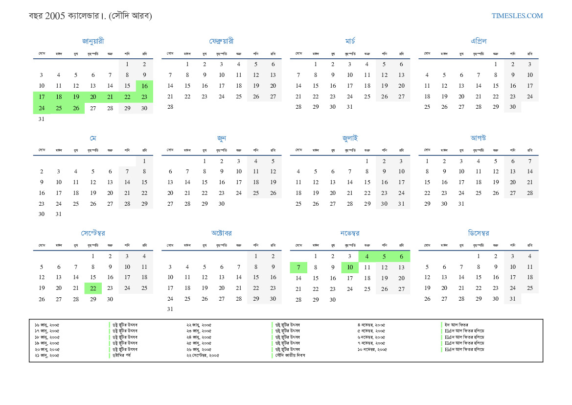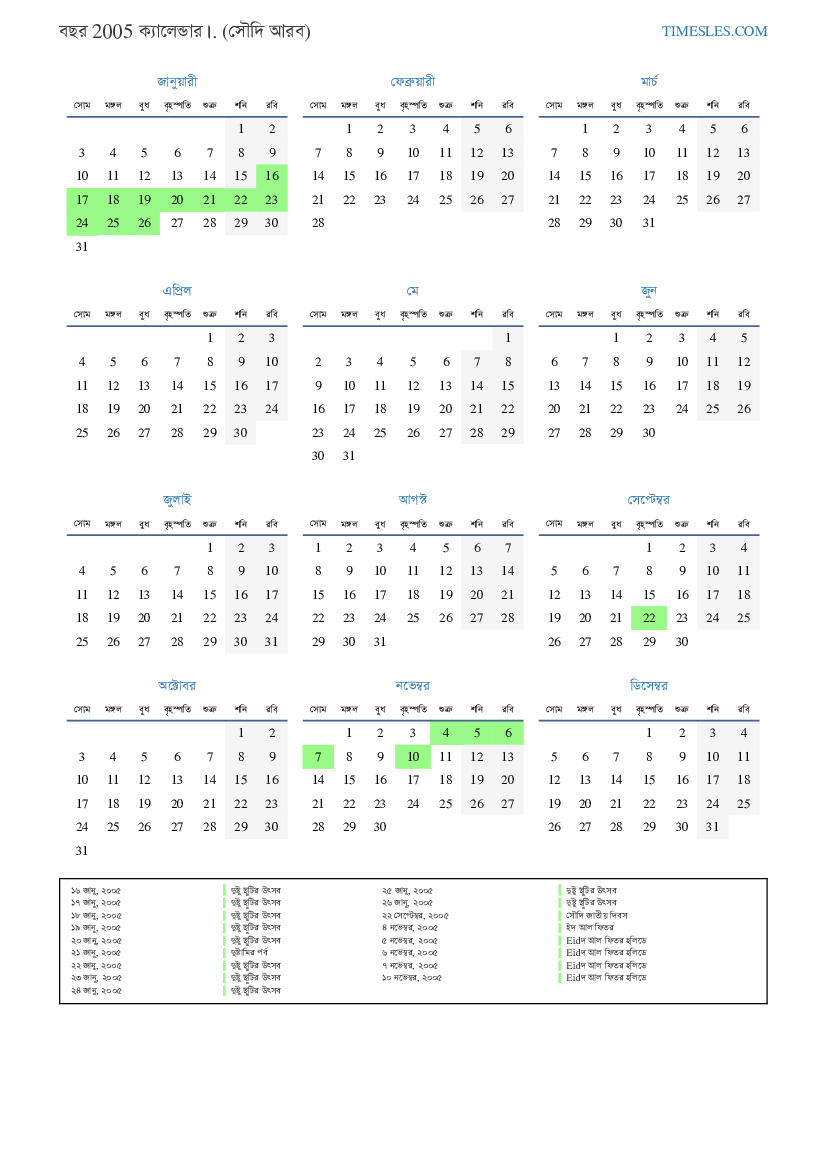 ৯ নভেম্বর, ২০০৫ Eidদুল ফিতর হলিডে (কেবলমাত্র সরকারী খাত)