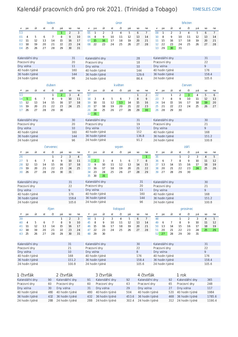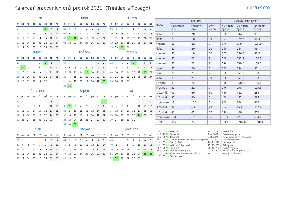 únor 2021 pracovní dny kalendář s týdny. Pětidenní pracovní týden. Na únor 2021 je v Trinidadu a Tobagu 4 svátky a dny volna. Kalendář s pracovní dobou a odkládáním svátků.