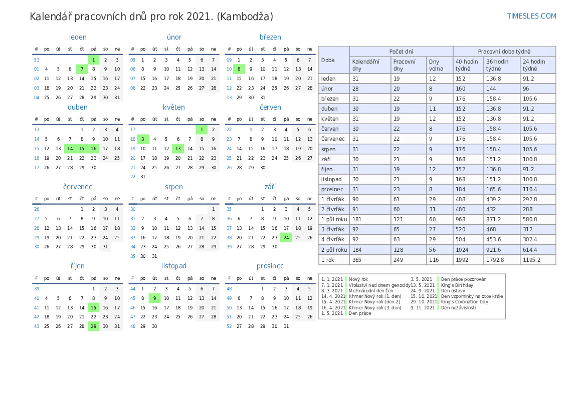 prosinec 2021 kalendář pracovních dnů pro Kambodžu