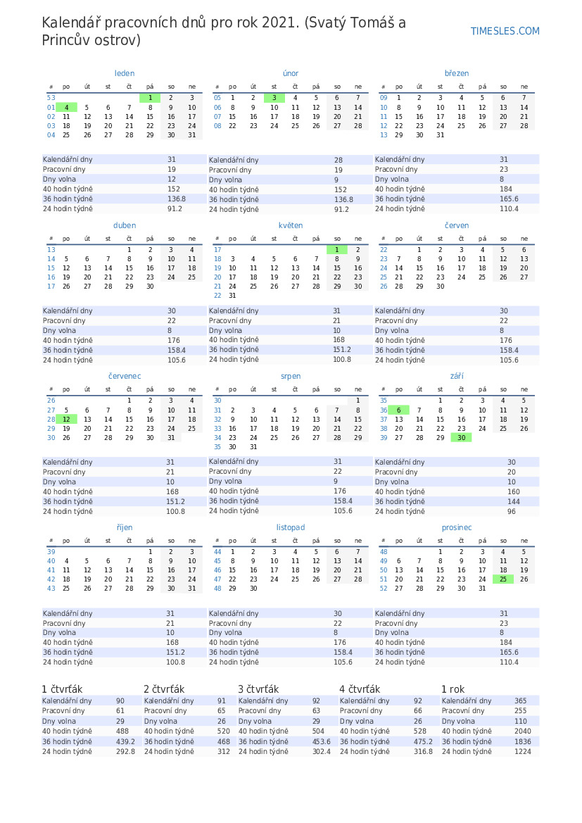 Ve 3. čtvrtletí roku 2021 je v Svatém Tomáši a Princově ostrově 4 svátky a dny volna. 3. čtvrtletí 2021 začíná ve čtvrtek a končí ve čtvrtek.