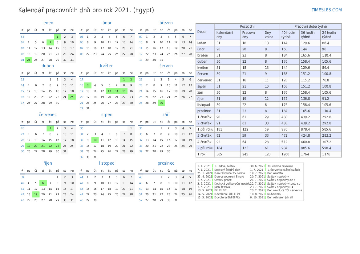 Kalendář pracovních dnů s prázdninami a víkendy na 4. čtvrtletí roku 2021 pro Egypt