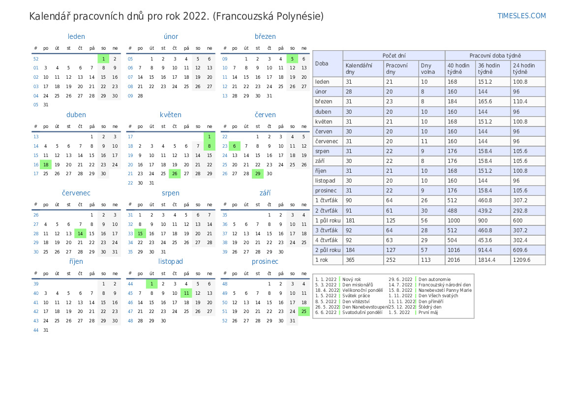 Stáhněte si a vytiskněte si kalendář pracovních dnů ve formátu PDF se svátky a víkendy na 2. čtvrtletí roku 2022 pro Francouzskou Polynésii