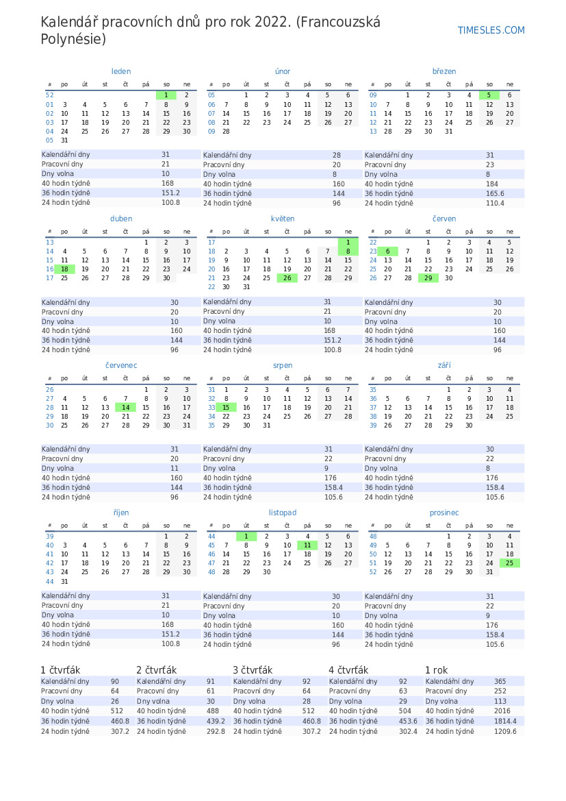 Kalendář pracovních dnů s prázdninami a víkendy na 2. čtvrtletí roku 2022 pro Francouzskou Polynésii