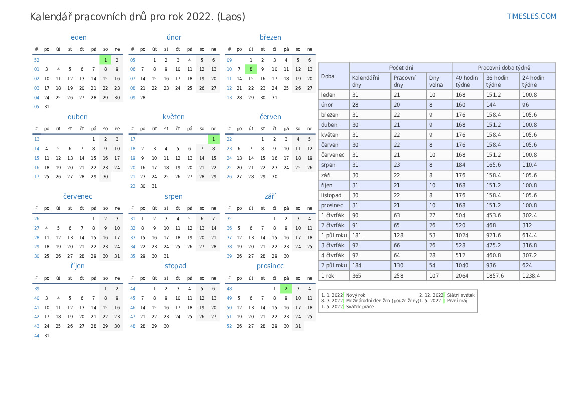 Kalendář pracovních dnů s prázdninami a víkendy na 2. čtvrtletí roku 2022 pro Laos