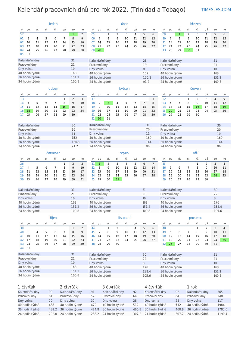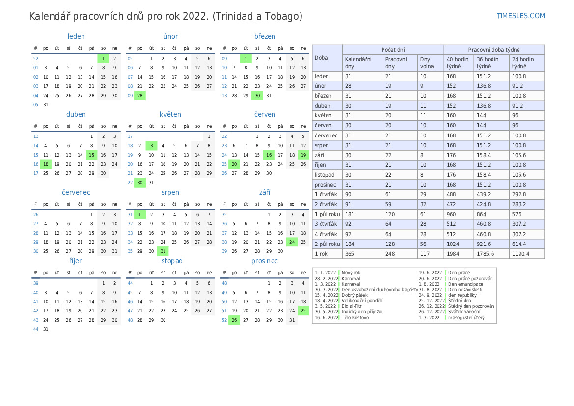 Kalendář pracovních dnů s prázdninami a víkendy na 2. čtvrtletí roku 2022 pro Trinidad a Tobago