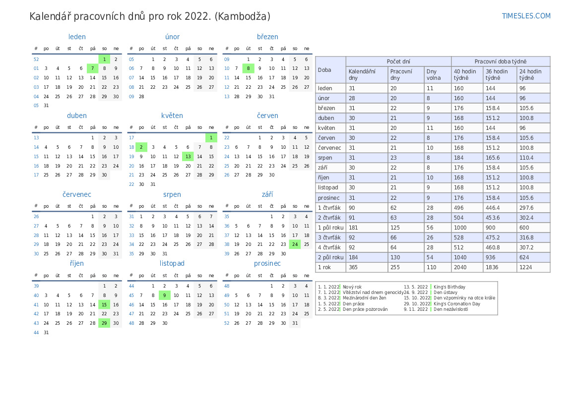Kalendář pracovních dnů s prázdninami a víkendy na 3. čtvrtletí roku 2022 pro Kambodžu
