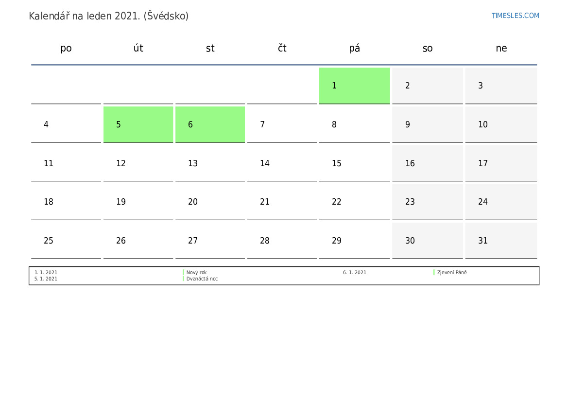 leden 2021 kalendář pro Švédsko