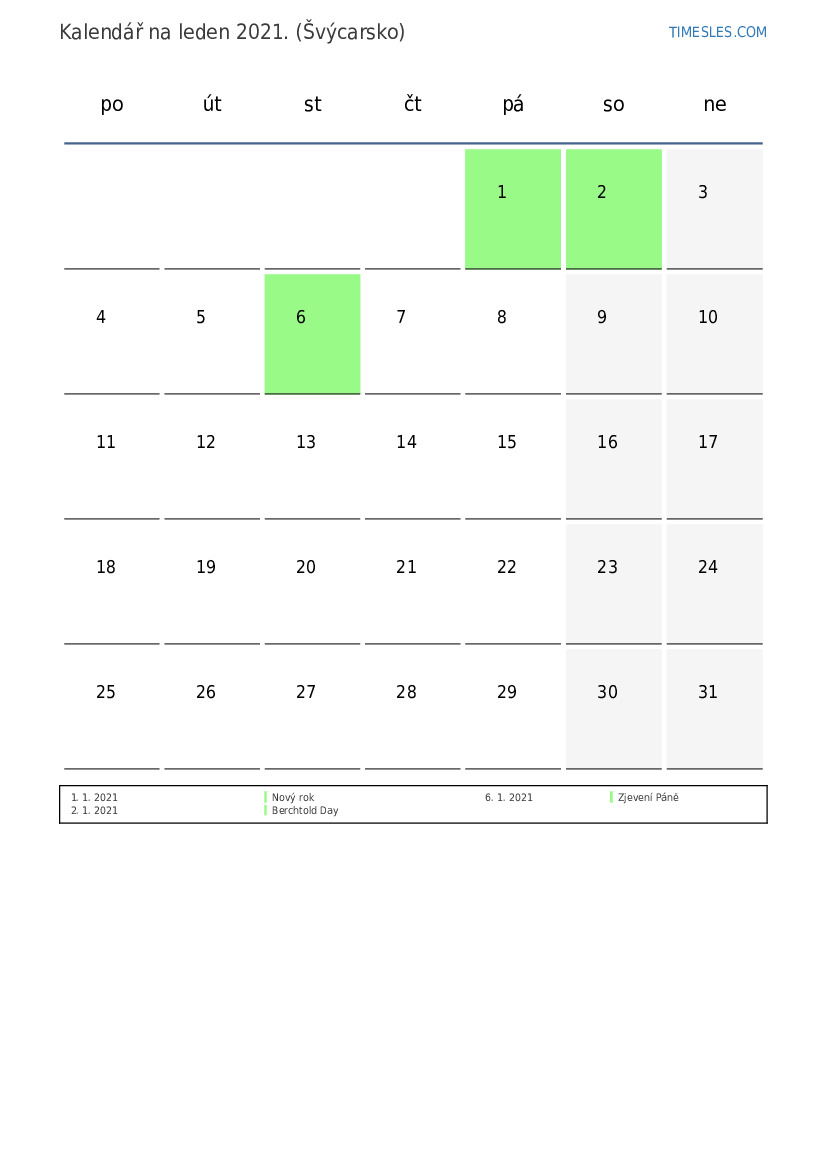 Stáhněte si a vytiskněte si kalendář PDF se svátky a víkendy na leden 2021 pro Švýcarsko