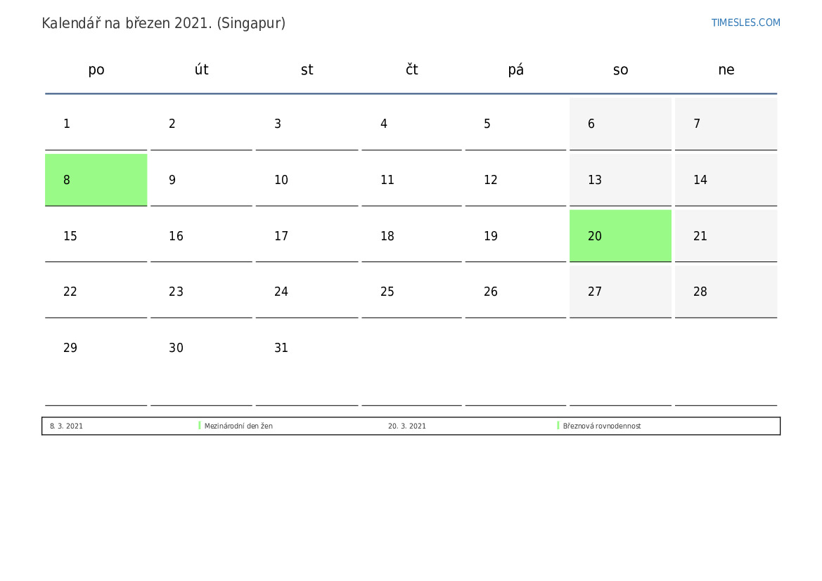 Měsíc březen obsahuje 31 dnů. Toto je 3 měsíc roku 2021. Sezóna roku: jaro. Měsíc březen začíná v Pondělí a končí ve středu. V měsíci březen 2021 je v Singapuru 2 svátky a dny volna.