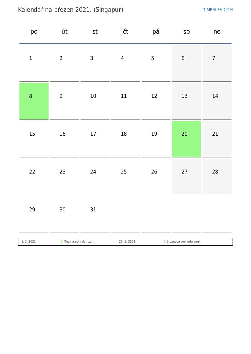 Stáhněte si a vytiskněte si kalendář PDF se svátky a víkendy na březen 2021 pro Singapur
