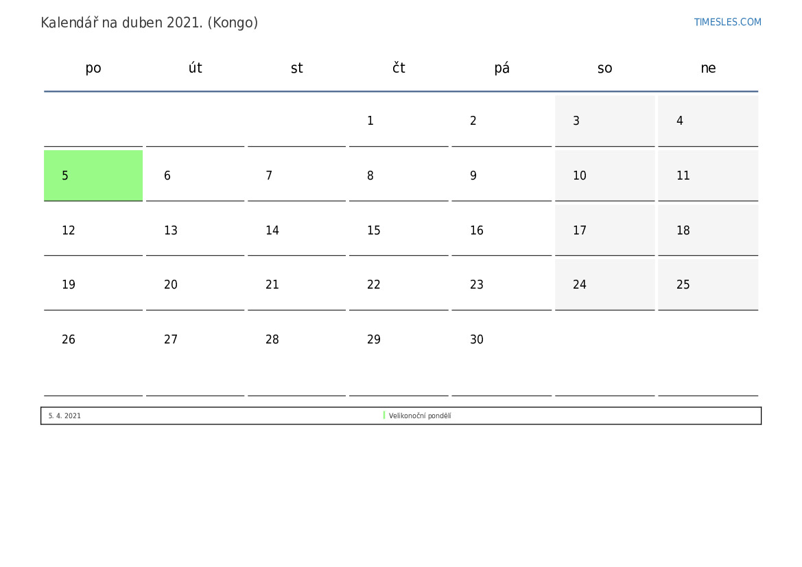 Stáhněte si a vytiskněte si kalendář PDF se svátky a víkendy na duben 2021 pro Kongo