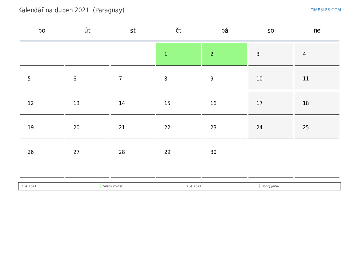 Stáhněte si a vytiskněte si kalendář PDF se svátky a víkendy na duben 2021 pro Paraguay