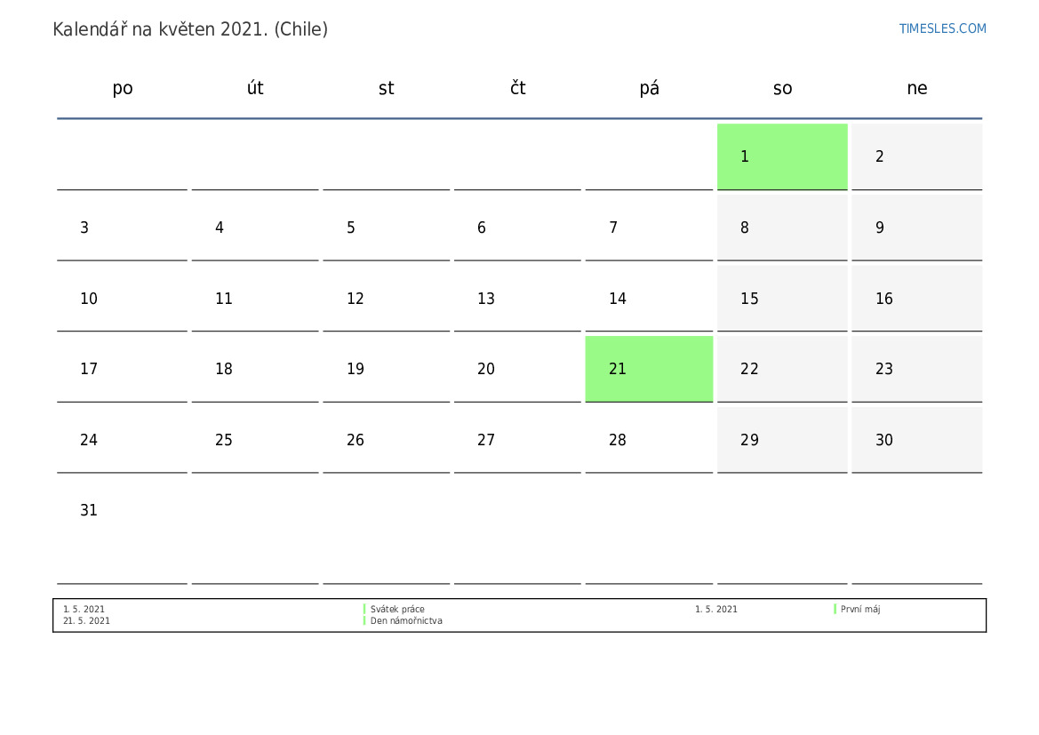 Stáhněte si a vytiskněte si kalendář PDF se svátky a víkendy na květen 2021 pro Chile