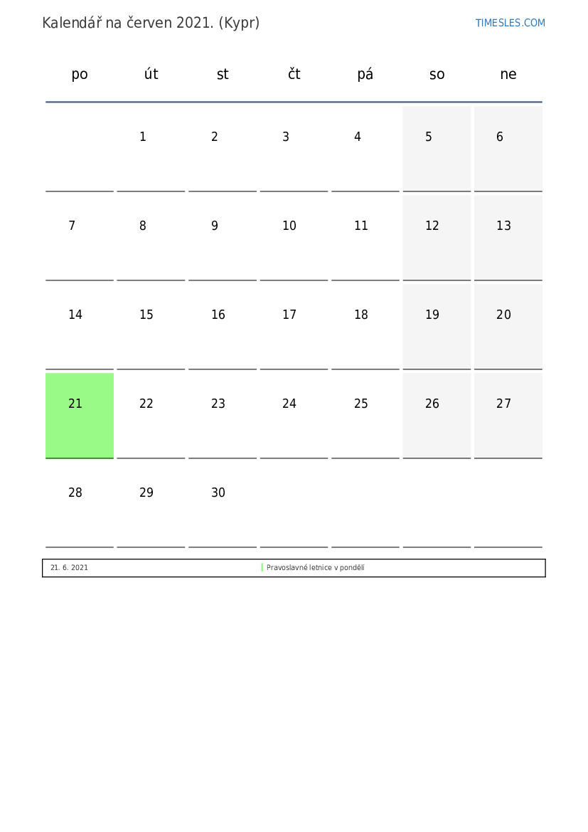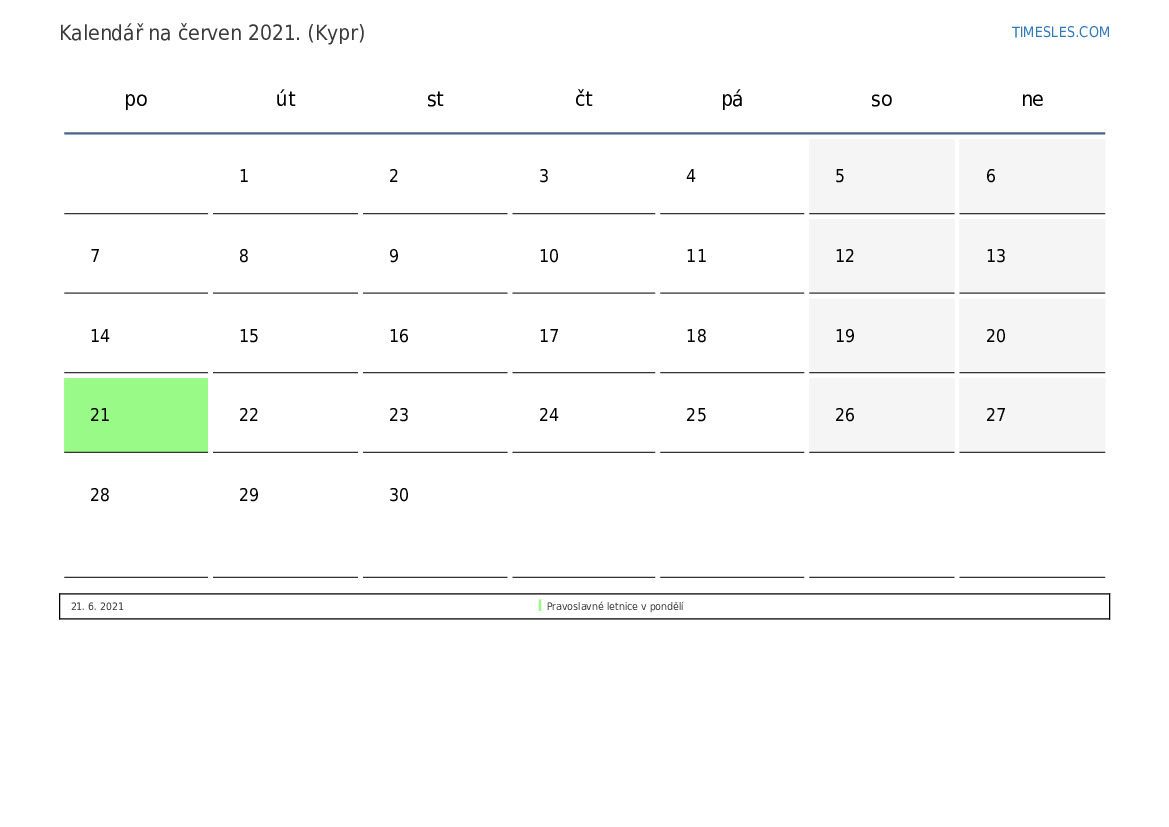 Stáhněte si a vytiskněte si kalendář PDF se svátky a víkendy na červen 2021 pro Kypr